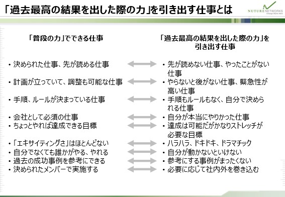 この「普段の仕事の力」と「過去最高の結果を出した際の力」の差はいったい何なのでしょうか。そこには以下のような仕事の性質・環境の違いがあると考えられます。