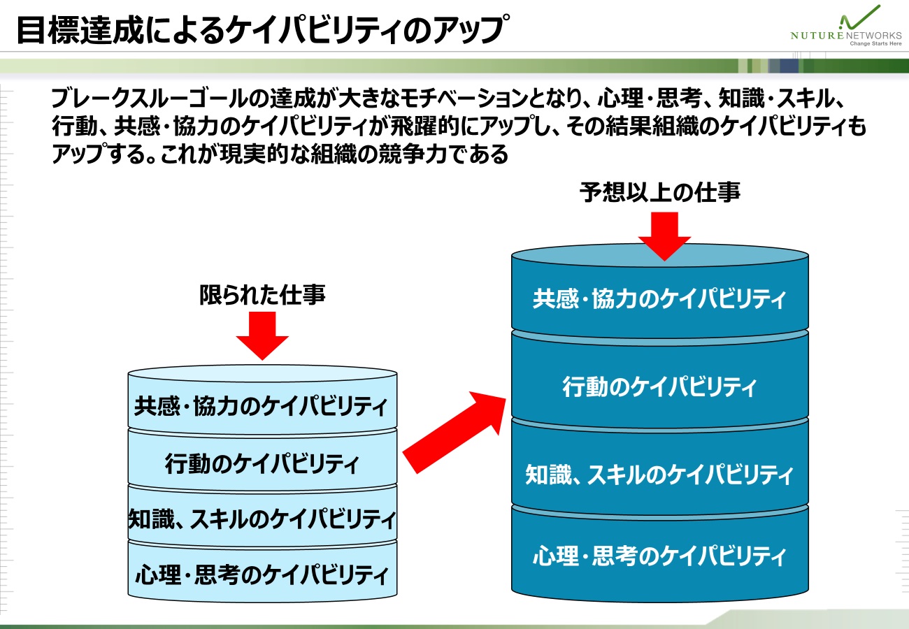 - 「いまここ」の瞬間に集中して取り組み、小さな達成感を連続して積み重ねることで、能力レベル(ケイパビリティ)を向上させる