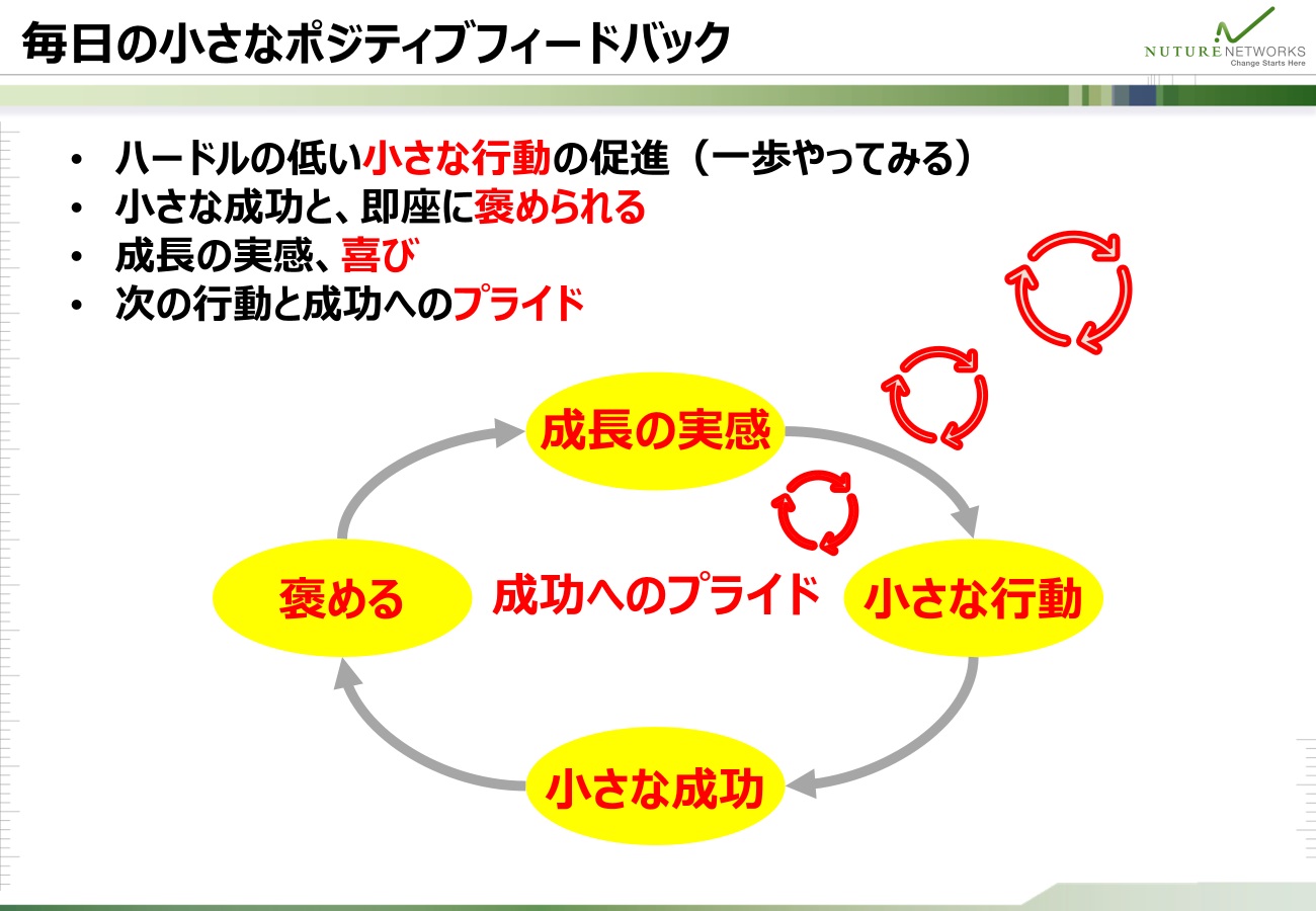 - 常に自分自身とまわりにポジティブなフィードバックを行なう