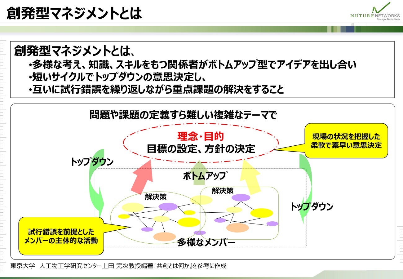 そのとき私が注目したのが、「共創(Co-Creation)」「創発(Emergence)」というキーワードでした。そして、多様な人や組織がパーパスを共有し、異なる意見をぶつけ合うことで、あらたな解決策を創造する活動が必要だと考え、関心をもつ日本企業を十数社集めて創発型経営研究会を立ち上げ、2年間ほど活動しました。このときご指導いただいたのが、当時、東京大学人工物工学研究センター長を務めておられた上田完次先生です。