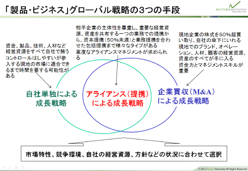 両者の真ん中にあるのが、アライアンス戦略です。現地のパートナー企業の経営資産を貸していただいて成長するというものです。詳しく分けると業務提携、資 本提携に分かれます。資本提携というのは買収ではなく、少数の資本を入れたうえで業務の提携をすることを指します。包括提携とか、資本業務提携と言ってお りますが、より強固なアライアンスをとっていくということです。