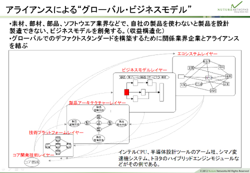 おそらく今まで多くの会社が、高品質を維持するために自前主義で考えてきました。私は、自前主義は決して悪いことではないと思います。自前主義くらいのス ピリッツがないと良い製品は作れません。アライアンスパートナーに一部を任せるにしても、全体を総合して考えるという自前主義のイデオロギーは決して悪く ないと思います。しかしながら、すべての製品、全てのプロセスを自前で行うことは破滅を呼びます。アライアンス発想というものがグローバルでのビジネスモ デル構想では大事なスキルとなります。