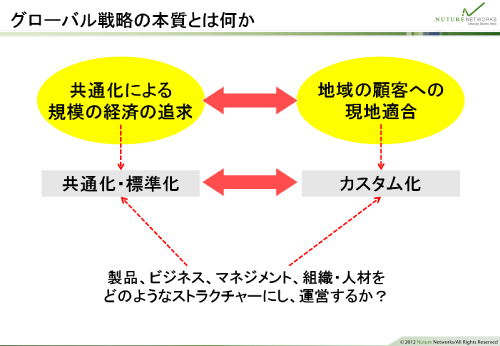 マネジメントの話に移りたいと思います。先ほども申しましたように、グローバル化の本質は共通化によるスケールです。スケールとカスタム化、これは人・組織、マネジメントについても言えます。