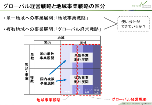 いわゆる「グローバル化」については、いくつかの段階に分けられます。まず日本から、たとえば東南アジアあるいは中国などへと事業を拡大する「地域展開」 があります。これも多くの場合グローバル化と呼ばれることが多いのですが、基本的にはエリアの拡大です。「地域事業戦略」と言えます。一方で「グローバル 経営戦略」と言った場合には、たとえば中国や東南アジアなど複数地域に進出して製品やビジネスを展開しつつ、さらにマネジメントをグローバルに展開すると いうことを指します。ネットワークをつないでいくということです。ここで大事なことは、事業のグローバル化と、マネジメントのグローバル化、そして人・組 織のグローバル化の三点です。この三点について同時にシナリオを描き、三位一体で展開していかなければなりません。