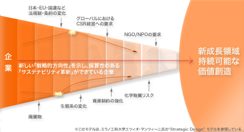 しかし、一方では、その対応にこそ次なる事業機会が潜んでいることも事実である。企業は、従来型のCSR経営を超越し、自社の事業モデルや商品・サービスを通じて、「環境・社会的課題の解決に寄与する」ことが、お客様をはじめとした利害関係者から求められている。たとえば、「電気自動車」を市場に投入し、成功させる。ソーラーパネル付きの住宅を新しい「標準」にする。あるいは、貧国バングラデッシュで現地にネットワークを持つ企業と提携し、栄養商品を展開したり、マラリア予防につながる事業を展開したりする。業種や企業の規模を問わず、いま、直接的に「課題解決型」の商品・サービスが求められている。そして、それらにどのように企画し市場化するかによって、自社の競争力が実際に左右される時代に突入しているのである。