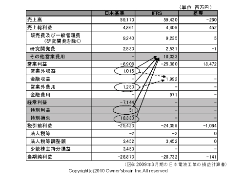 図6は、2002年3月期からIFRSを導入している日本電波工業です。IFRSでは、経常利益が表示されず、日本基準での営業外損益、特別損益が、その他営業費用に組み替えられており、営業利益が大きく異なることが分かります。