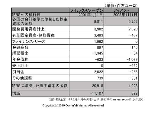 では、実際に、IFRSが適用されることによって、財務上どのような影響があるのでしょうか。図3は、先行して適用されているEUにおける自動車メーカーの2社のIFRSの適用による株主資本の影響額を示したものです。