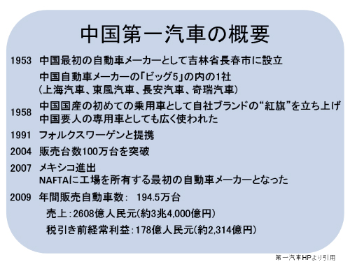 現在わたしの所属する中国第一汽車は1953年に中国発の自動車メーカーとして中国・東北・吉林省長春市に設立されました。設立後中国国産自動車メーカーとして初めての国産自社ブランド“紅旗”を立ち上げました。その後ドイツフォルクスワーゲン・日本トヨタ自動車と事業提携し、2004年には販売台数が100万台を突破し、2007年にはメキシコに進出。NAFTAに工場を所有する最初の自動車メーカーとなりました。
