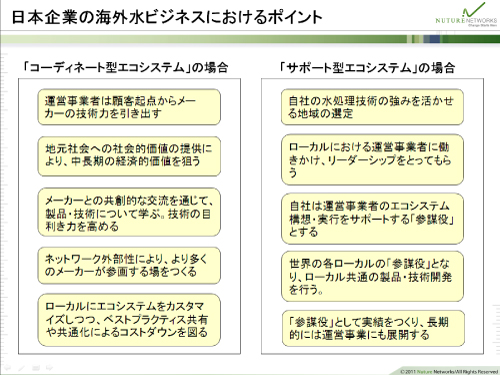 ここでポイントは、各ローカルにエコシステムをカスタマイズしつつも、ノウハウの共有、専門知識をもった人材の一括教育、人材の戦略的な異動・配置を行うことでしょう。また装置や部品はなるべく共通化して、規模の経済を働かせて、コストダウンを図ることも必要です。この切り口で水インフラ分野をまず押さえ、合わせて電気や道路などの他の社会インフラにシナジーを考慮しながら展開していくことになります。運営事業の場合、このようなポイントを押さえて、コーディネート型エコシステムを展開することがポイントです。