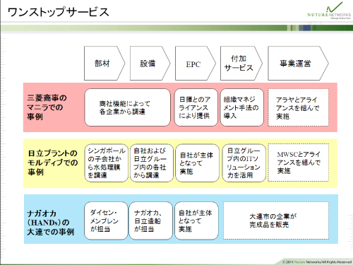 近年はシェアを低下させつつあるものの、数年前まで水ビジネスといえばヴェオリア、スエズなど水メジャーの活躍が目立っていました。これらの企業の強みは、事業運営ノウハウや情報力などもありますが、ワンストップで事業を受注できることにあります。