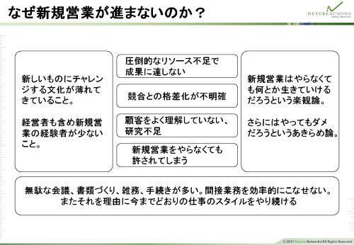 それは、「新しいものにチャレンジする文化が薄れてきていること。経営者も含め新規営業の経験者が少ないこと」。すべての会社には創業期がある。その創業期には、一人またはごく少数の人が、極めて困難な「新規営業」から仕事を始めていたはずだ。そこではすべてのことが新しいことに対するチャレンジであったはずである。しかし会社が大きくなり、市場も順調に成長する中で、新しいことに対してチャレンジすることはほとんど語られなくなり、また実際のチャレンジも少なくなった。そのうち市場が低迷し、リスクが高くなり、ますます新しいことにチャレンジする人は少なくなる傾向にある。人事制度の成果主義導入の行き過ぎからか、新規営業、新規事業にチャレンジして成功体験をもつ役員が、“実は一人もいない”ことも少なくない。これでは「新規営業」は進まないのも当然である。新規営業の精神、理念が薄まっている。ここに「新規停滞」の本質的な問題がある。