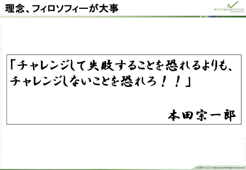 本田技研工業では、経営戦略としてプライベートジェット機事業を手がけ、またロボットの「アシモ」に本気で挑戦している。その結果直接その事業に関わっていない社員であっても、そのチャレンジ精神を日常の業務の改革、改善にぶつけ、経営が真に活性化するよう努力している。本田のチャレンジ精神はまさに経営の理念、フィロソフィそのものと言える。