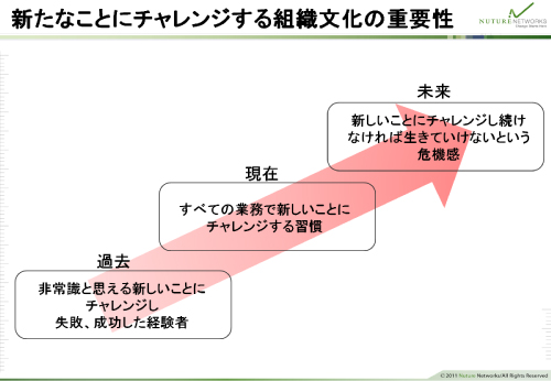 1つは「新しいことにチャレンジすること」を実践しつづけることで「非常識と思える新しいことに チャレンジし失敗、成功した経験者」を数多く生み出すことである。正確に言うと「失敗」という概念は無く、未来の成功の材料なのである。実際新規事業、新製品、新規営業の成功の要素を確認してみると、その多くは過去の「失敗」からの学習である。重要なことは、他社よりも、成功の要素となる学習を質、数ともに蓄積することと言える。