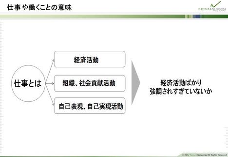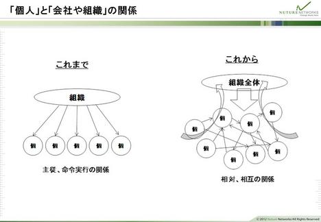 組織という「何者か」が個人に命令、指示を下し、そこに仕事が発生するという主従、命令実行の関係ではなく、組織とは、自立した個人や組織が相互に関係しながら、組織全体の方向付けを行っていく個と個の相対的、相互の関係であるべきである。主従、命令実行型の組織パラダイムから、個と個の相対、相互の関係のパラダイムに変換することは容易なことではないが、今の日本の閉塞感を打ち破る一つの光と言える。