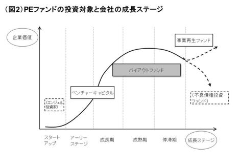 PEファンドはさらに細分化されており、どの成長ステージにある企業を投資対象とするか、によって異なっている。バイアウトファンドの主な対象が成熟段階にある企業であるのに対して、その他のPEファンドの投資対象は以下のとおりである。