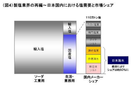 日本海水は、当初は日本ソルトと赤穂海水の2社でスタートしたが、その後、同業である讃岐塩業を買収し3社が合併することで、製塩業界の国内シェア50%を有するリーディングカンパニーが誕生した。