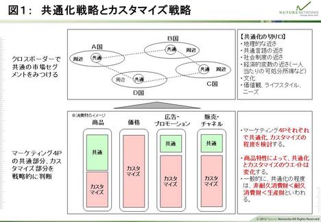 グローバル展開の大きなメリットは、規模の経済によるコストダウンと範囲の経済による売上の増大である。ターゲットの国や地域ごとに製品・事業を個別に構築していたのでは、現地に特化している企業と同じレベル以上の戦いはできない。また、共通化だけで差別化できない場合には、事業環境に合わせて製品・事業をカスタマイズする必要がある。