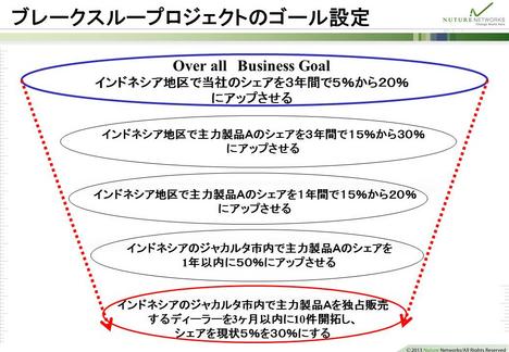 達成すべきゴールを極限まで明確化する。「シェア10%アップ」といった表現でなく、「顧客Aでの自社商品Zのシェアを8週間で 10%から20%にアップさせる」といった曖昧さを排除した明確な表現をする。