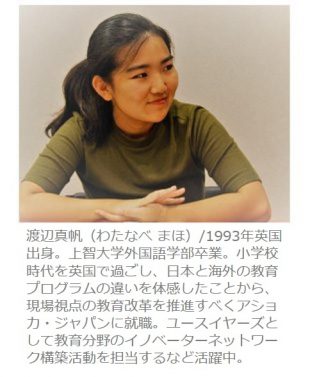 グローバル社会において、国家や企業では解決し難い社会課題をしっかりと見つめ、理念とビジョンをもって解決に挑む、世界最大の社会起業家支援非営利組織「アショカ(ASHOKA)」。今回インタビューした渡辺真帆さんは、アショカ・ジャパンのスタッフとして活躍しています。渡辺さんとは、昨年2016年10月に私が担当する上智大学のスタートアップの授業で、クラスの一生徒として出会いました。当時外国語学部4年生だった渡辺さんはクラスの中で、社会課題の解決にベンチャーとして取り組むグループに所属し、都会の子どもを対象にした自然豊かな地方の学校ビジネスを企画していました。多くの4年生が皆就職の内定をもらって落ち着く中、渡辺さんは自分の意志で就職決定を保留していましたが、年末も押し迫るころ「アショカ・ジャパンに行って社会システム改革をやることに決めました」と、授業の始まる前に伝えに来てくれて、即私は「それは素晴らしい。良かったね。」と答えたのを覚えています。アショカについては、名著「チェンジメーカー」(アショカ・ジャパン代表理事 渡邊奈々著)で数年前から知っており、私も若かったらこんな組織に参画したいと思っていました。上智大学の卒業生がグローバル社会の様々な課題に正面から取り組む組織に所属することは、上智大学非常勤の一教員として本当に誇りに思います。