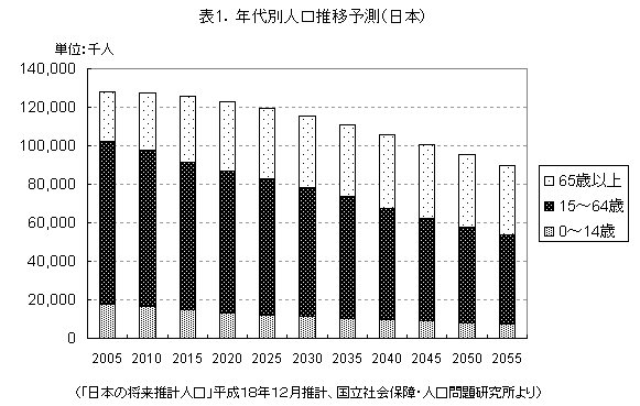 まず1つ目は、少子高齢化に起因する日本の労働人口の減少です。日本の労働人口は今後も減少を続け、2050年には、2010年現在の81,000千人より40%も少ない49,000千人程度になる見込みです。これは、どの産業にも共通する問題ですが、あらためて下のグラフ(表1)を見ると、今後の人材獲得が難しくなることが一目瞭然です。企業の人材不足は避けることができません。