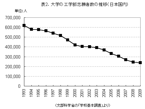 さらに2つ目として、製造業にとってはもう一つの深刻な問題があります。それは、学生の工学部離れです。下のグラフ(表2)からは、1993年には62万人いた工学部志願者が、16年後の2009年には24万人に減少していることがわかります。もちろん少子化の影響もあるのですが、他の学部の志願者数と比べると、極端に工学部の志願者数が減っています。約15年で、工学部志願者数は実に60%以上(38万人)減っており、製造業人気が低迷していることを示唆しています。