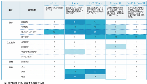 次に、社員の現状を可視化します。求める人材像で定義した職種、専門分野に対し、それぞれどのレベルの社員が何人いるか、ということを把握します。下図のような人材ポートフォリオを作成することにより、社内の人材分布が一目瞭然になります。