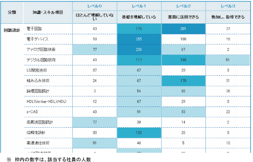 また、簡単なアセスメントなどを行うことによって、社員一人ひとりの能力の棚卸しを行います。すると、図4のように、各スキルにおいて、どのレベルの人材が何人いるのかを一覧できるスキルマップが作成できます。