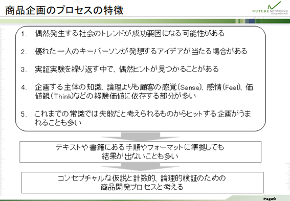 結論として大事だと思うのは、商品企画開発プロセスとは、コンセプチャルな仮説を持つことと、その仮説を計数的、論理的に検証することです。言い換えれば、熱い思いの仮説をもつことと、顧客に受け入れられたかどうかの結果の数値と、論理的根拠を明確にする課程であり、その課程で商品が売れる法則性を見いだし、継続性のある事業システムを構築することです。