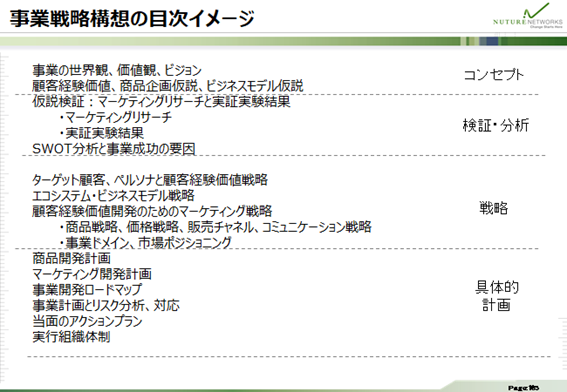 コンセプトの提示が済めば、それを検証・分析したプロセスと結果を示します。検証・分析は大きくマーケティングリサーチと概念実証(PoC)で説明されます。マーケティングリサーチには、新しく提案された顧客経験価値を検証すべく、マクロトレンド分析、エコシステム分析、有望市場分析、ペルソナ、ターゲット顧客分析、競合分析などが含まれます。またPoCには、新たに設定された顧客経験価値仮説の実現に関するKPIと、実証実験によるその達成可能性が示されます。マーケティングリサーチと、PoCの結果からSWOT分析とそこから導き出される事業成功の要因が示されます。