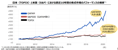 日本は「失われた30年」と言われ、低成長が続いていますが、米国はどうでしょう。実は米国のGDPの成長のほとんどはGAFAMが占めています。ここ2、30年に設立され、巨大になったITをベースとしたスターアップ企業が米国のGDPの成長を支えているのです。伝統的な大企業をだけ見ると米国も日本もそう変わらず低迷しているのです。
