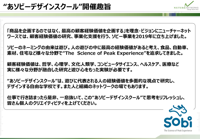 そこで各分野で最先端、また独自の切り口で研究されている方々をお呼びして、学習意欲、好奇心の高い方々と一緒に学ぼうということで、ニューチャーネットワークス主催のオンライン勉強会「顧客経験価値研究“あソビーデザインスクール”」を企画、開催しております。