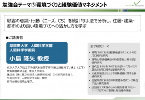 「建築環境学」がご専門で、住居・建築・都市などの環境をよりよいものとするため、音・光・熱・空気などの環境要素や環境を使う人間 (利用者、居住者、市民等) の意識や行動を研究されていらっしゃる小島 隆矢教授をお招きし、環境に対する顧客のニーズ・CS (顧客満足) を把握することの意義、そして「表面的なニーズ」ではなく「真のニーズ」を捉えるため、実際に行われている取り組みなどについて事例を交えてご講演いただきました。
