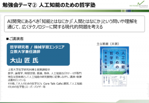 哲学研究者、機械学習エンジニアとして、人工知能の研究開発を行っている大山匠様をお招きし、「知能とはなにか」「人間とはなにか」という問いや理解を通じて、広く人工知能と哲学に関する現代的問題について、AI、哲学に普段接していない方にもわかりやすくご講演いただきました。