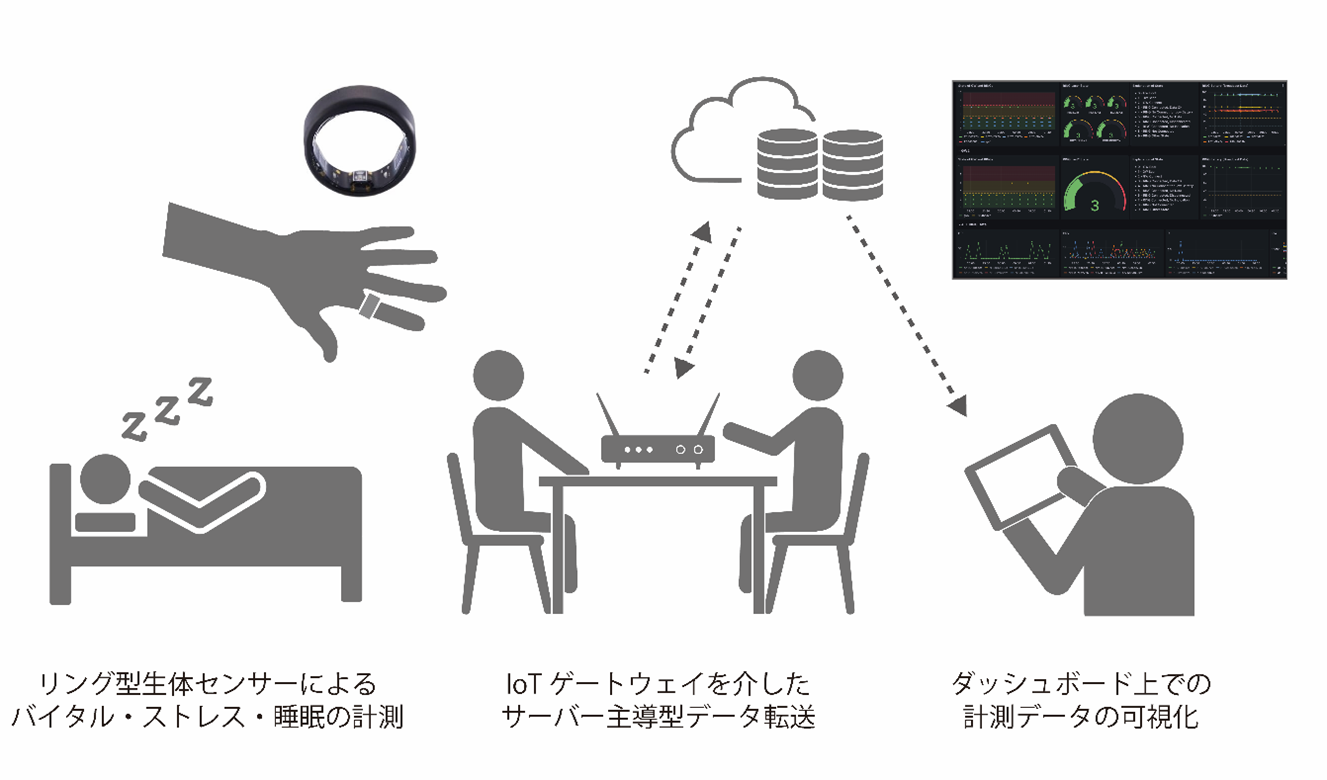 ヘルスケアAIoTコンソーシアム(会長:山本義春、東京大学大学院教育学研究科・教授)は、PoC(概念実証)部会(座長: 中村亨、大阪大学データビリティフロンティア機構・特任教授)と会員企業の株式会社SOXAI(代表取締役:渡邉達彦)、株式会社シマノ科研(代表取締役:島野俊之介)、大和ハウスライフサポート株式会社(代表取締役社長:東雅樹)との共同で、リング型デバイスとIoT(Internet of Things)ゲートウェイを用いた高齢者見守りサービスの実証実験を、大和ハウスライフサポートの運営する介護付き有料老人ホーム 「もみの樹・渋谷本町」(館長:勝又賢人)にて開始しました。バイタル・ストレス・睡眠等のさりげないセンシングに基づいた入居者のウェルビーイングの見守りが期待できます。本プロジェクトで使用する技術は、科学技術振興機構(ムーンショット型研究開発事業 目標9:JPMJMS229B)からの大阪大学(中村亨)・東京大学(山本義春)への支援により開発されたものであり、AI(人工知能)とIoTとの融合技術(AIoT;AI × IoT)による心身の状態やウェルビーイングの可視化およびそれによるサービス展開を目指しています。